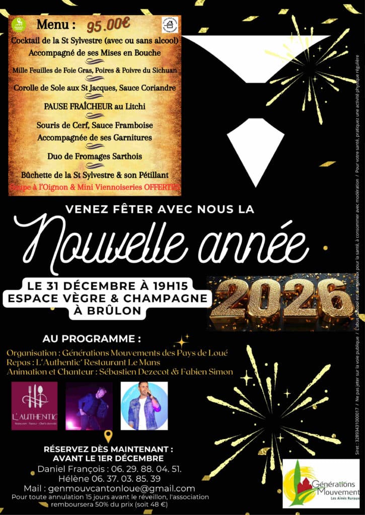 Génération Mouvement Pays de Loué a le plaisir de vous convier à sa grande soirée de la Saint-Sylvestre, un moment privilégié pour clôturer l’année 2025 dans une atmosphère conviviale, élégante et chaleureuse. Cette soirée est ouverte à toutes les personnes souhaitant partager un instant festif, se retrouver entre amis, en famille, ou simplement profiter d’une ambiance soignée pour célébrer le passage en 2026.